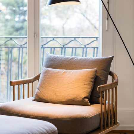 matière naturelle, des couleurs claires, un style épuré, la quiétude d'un salon face au parc.mobilier, Alki, & tradition, Ercol, Nani Marquina, Ferm living, Muuto.